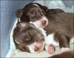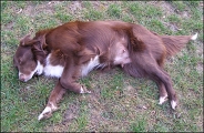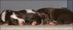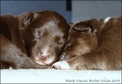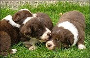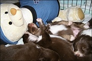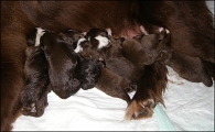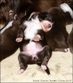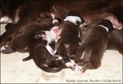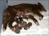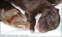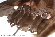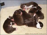 62 den březosti: 18,00 hod - jelikož poslední štěňátko v bříšku bylo možné nahmatat, ale Jackie i přes veškerou snahu jej nemohla vytlačit, vyrazili jsme kolem páté na veterinu. Po injekci Oxytocinu Jackie porodila hnědobílého chlapečka, bohužel se jej i přes čtvrthodinový pokus o oživení nepodařilo rozdýchat... bohužel i takový je život. ...spi sladce hnědulínku, byl jsi náš sice krátce, ale naším juniorkem zůstaneš navždy... Ostatních 7 statečných se má čile k světu a teď odpočívají společně s Jackie.