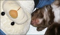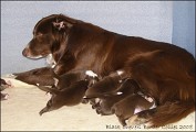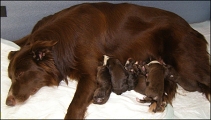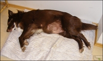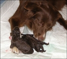 11,21 hod - vzápětí se narodil hnědobílý pejsek s pálením, váha 365 gramů. 11,10 hod - a je to tady !!! První štěňátko vykouklo na svět - je to hnědobílá princezna s váhou 390 gramů:-) 10,40 hod - máme první stahy.... 10,00 hod - zatím nic nového, Jackie řeší uspořádání podložek v porodní bedně, hodně kňučí a hrabe. Je jasné, že "děcka" se už řadí do zástupu, nicméně porodní stahy ještě nejsou. 9,10 hod - Jackie praskla první plodová voda! 8,45 hod - vyrazily jsme na malou vycházku - Jackie se tvářila jakoby nic, ale nešlo si nevšimnout, že se snaží vyprázdnit ze všeho, co za poslední dny pozřela a že jí odešla hlenová zátka. Po návratu domů už divočí v porodní bedně, dvě deky jsou na cucky a štěňata v bříšku sebou pěkně melou:-) Dneska se jich určitě dočkáme:-) 6,00 hod - Jackie celou noc strávila kňouráním, občasným hrabáním a neustálým dožadováním se pozornosti - s výrazem... chtělas štěňata, tak trp, spát nebudeš..., takže "trpíme" obě, po hodině běháme ven na venčení a spánek by se dal spočítat v minutách. |
