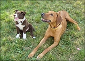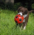 Junioři tráví většinu dne venku na zahradě, kde dovádějí, hrají si, v teplém počasí divočí v "pidi bazénku", prostě si svůj štěněcí věk náležitě užívají. Už jsme zvládli třetí odčervení a také včera první očkování. Jako dárek od pana doktora dostali každý svůj čip a pet passport:-)) Vše zvládli statečně. Dnes byl velký den pro kluky - dorazila návštěva - Katja (www.cabaroo.com), spolumajitelka tatínka Sparka. A jelikož rozhodla, kdo bude tatínkovým následovníkem a za týden vyrazí na sever do země "milionů jezer", mohli jsme klukům přiřadit jejich vlastní jména:-)